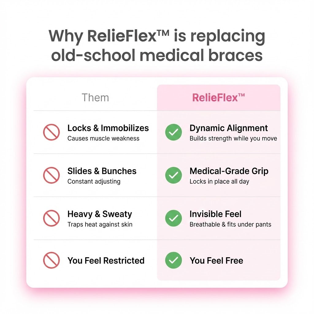 Old-school medical braces lock your knee in a cage, causing stiffness and muscle atrophy. RelieFlex uses Dynamic Stabilization to support the joint while you move—so you build strength with every step.